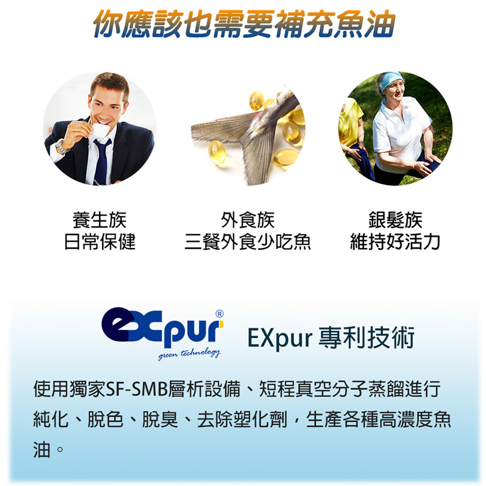 EPA含量達95%以上,食品級高濃度深海魚油,使用EXpur專利技術,膠囊小易吞食。